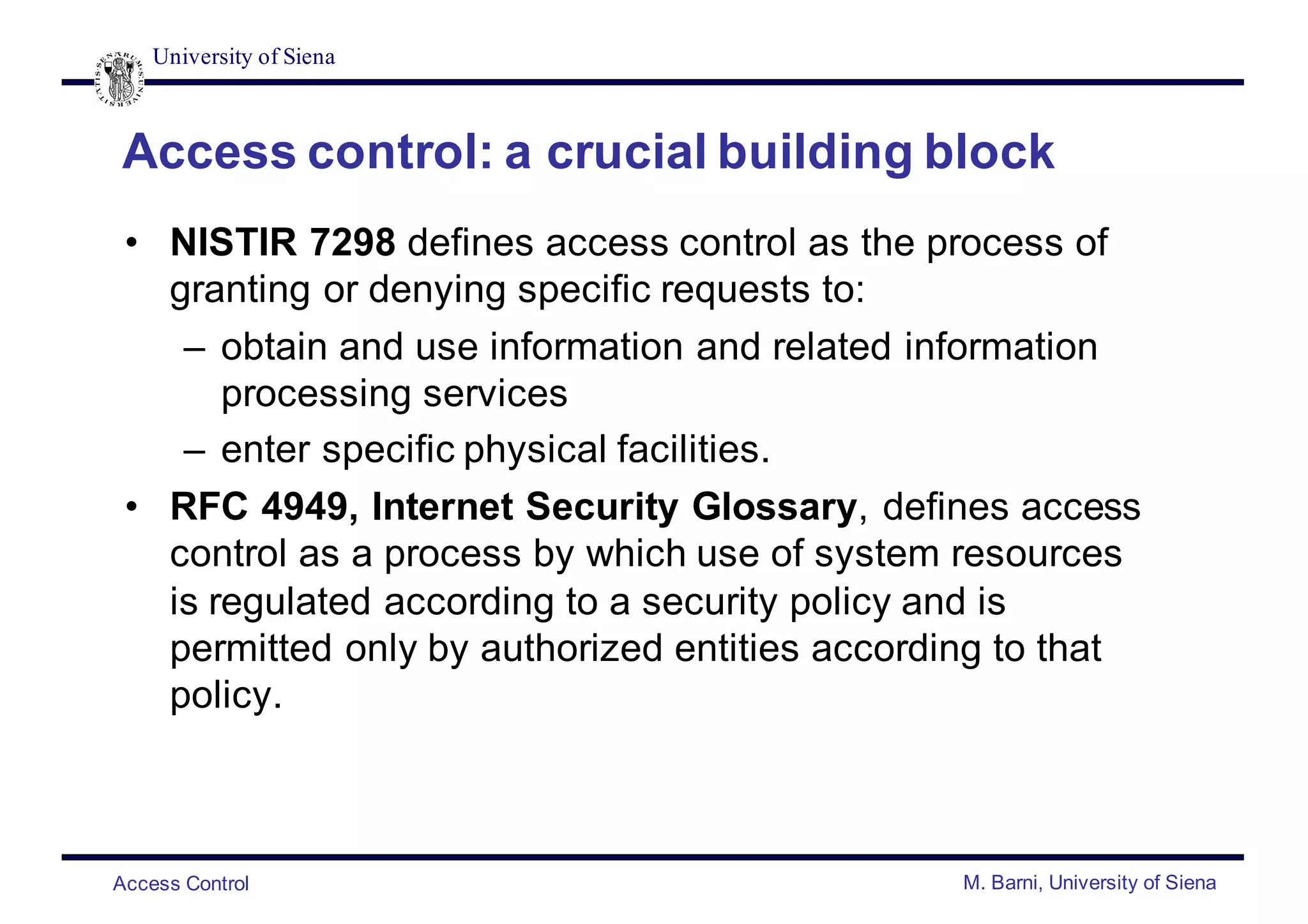 This document discusses access control and provides an overview of different access control models. It defines access control as the process of regulating use of system resources according to a security policy. The key points made are: