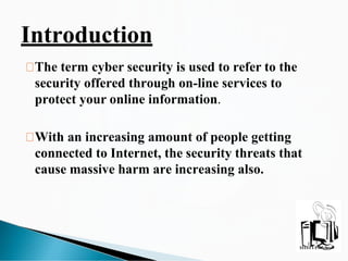 This document provides an introduction to cyber security. It defines cyber security as protecting online information through online services. It discusses the increasing security threats as more people go online. It then defines the term "cyber" and discusses major security problems like viruses, hackers, malware, Trojan horses, and password cracking. It provides examples of each threat and recommends solutions like installing security suites, using strong passwords, and being aware of international cyber crime statistics. The conclusion encourages spreading cyber security awareness.