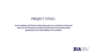 The document outlines a cybersecurity capstone project focused on scanning the website www.royalenfield.com to identify open ports and vulnerabilities. Tools like Burp Suite, Nmap, and Nikto were employed to uncover issues such as a critical OTP bypass vulnerability and missing security headers. Recommendations include strengthening OTP validation, closing unnecessary open ports, and adding security headers to enhance overall web security.