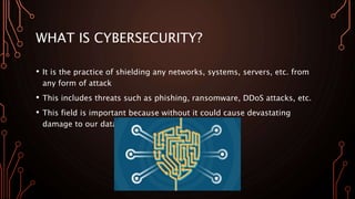 Cybersecurity is essential for protecting networks and systems from attacks such as ransomware, phishing, and DDoS. Each type of threat poses significant risks, with ransomware encrypting files for ransom, phishing stealing personal data, and DDoS disrupting server traffic. To safeguard against these threats, individuals should use strong passwords, verify communications, and install antivirus software.
