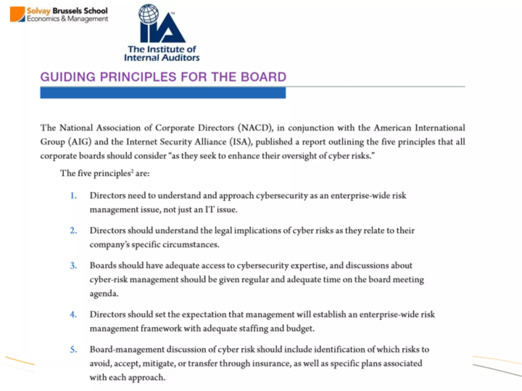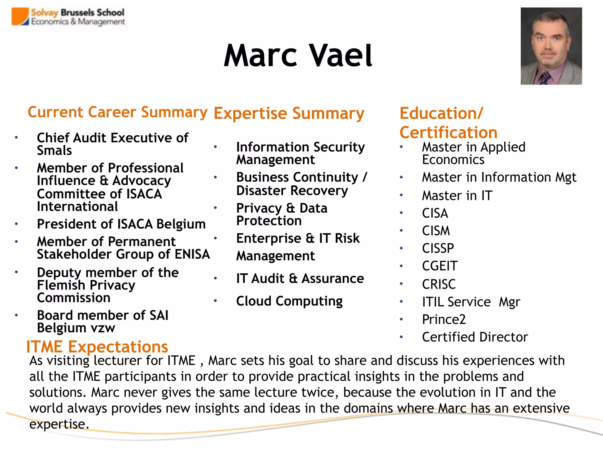 Marc Vael is an expert in information security management, business continuity/disaster recovery, privacy & data protection, enterprise & IT risk management, IT audit & assurance, and cloud computing. He has extensive experience as Chief Audit Executive, board member of several organizations, and lecturer. As a visiting lecturer for ITME, Marc aims to share practical insights from his experiences to provide perspectives on problems and solutions in domains where he has expertise. He presents different lectures each time to incorporate new insights from the evolving fields of IT and the world.