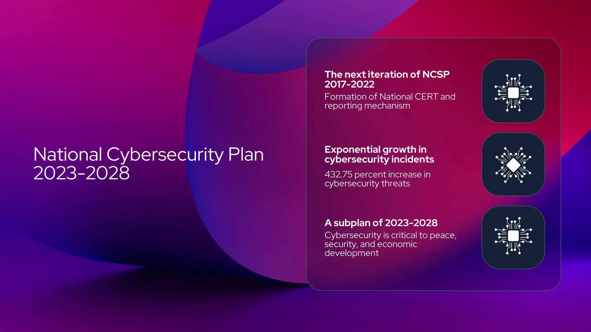 The document outlines the National Cybersecurity Plan for 2023-2028 in the Philippines, emphasizing the exponential growth in cybersecurity threats and the necessity of establishing a national CERT and reporting mechanism. It highlights the importance of cybersecurity for economic development, the protection of critical infrastructure, and the promotion of a cybersecurity culture. Additionally, the plan includes strategies for enhancing regulatory efficiency, expanding internet access, and improving national security against cybercrime and other threats.