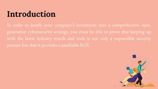 This document outlines the necessity of a comprehensive cybersecurity strategy focused on prevention, detection, and response to justify ROI for companies. It emphasizes the importance of educating employees, identifying vulnerabilities, and developing effective incident response strategies to combat increasing cyber threats. By orchestrating existing security tools and understanding vulnerabilities, companies can enhance their security posture and ensure a profitable ROI.