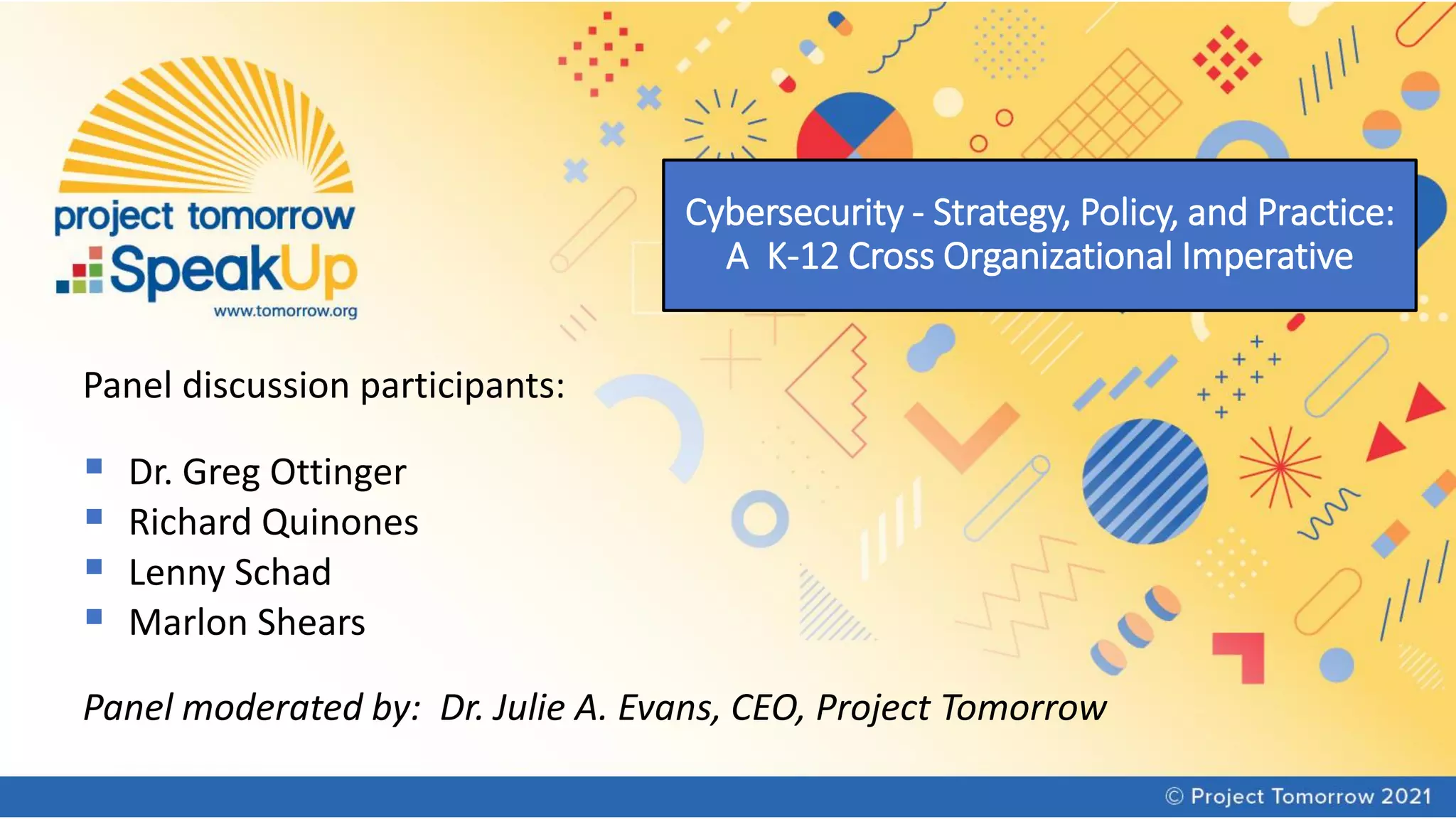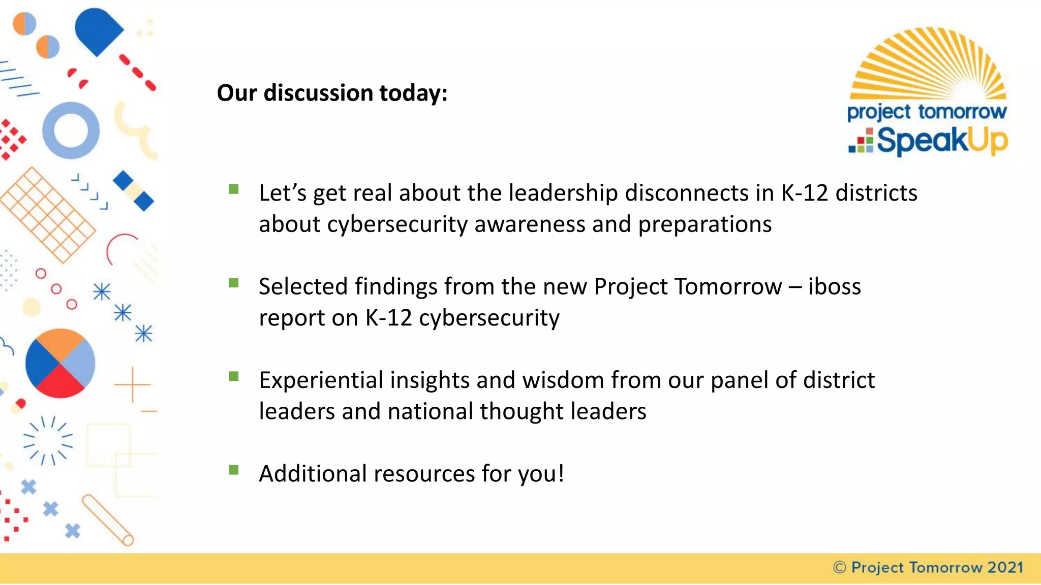 The document summarizes a panel discussion on cybersecurity strategies, policies, and practices for K-12 schools. The panel discusses the disconnect in leadership awareness of cybersecurity issues, findings from a new report on the topic, and resources for improving cybersecurity culture and preparedness. Key insights from the report include the need for shared accountability, reassessing management of technology assets, and ensuring adequate funding to support readiness and mitigation efforts.