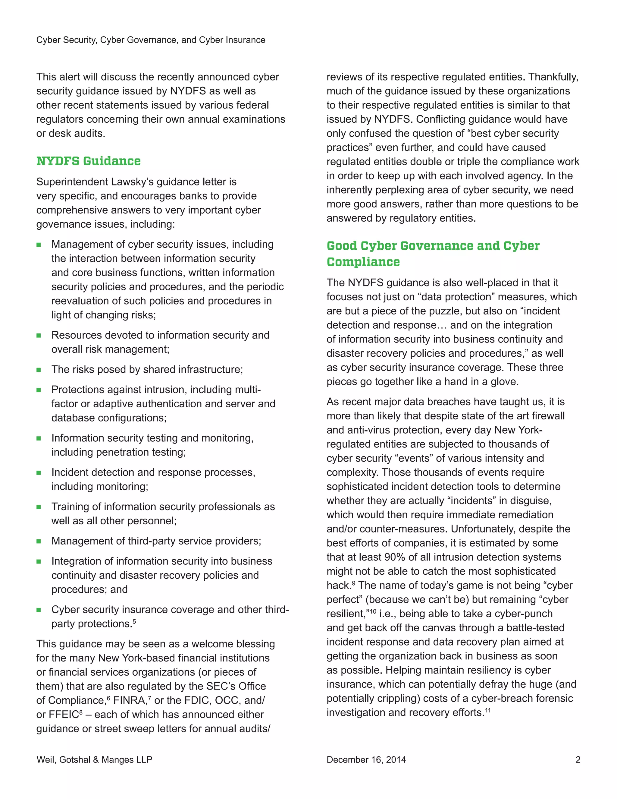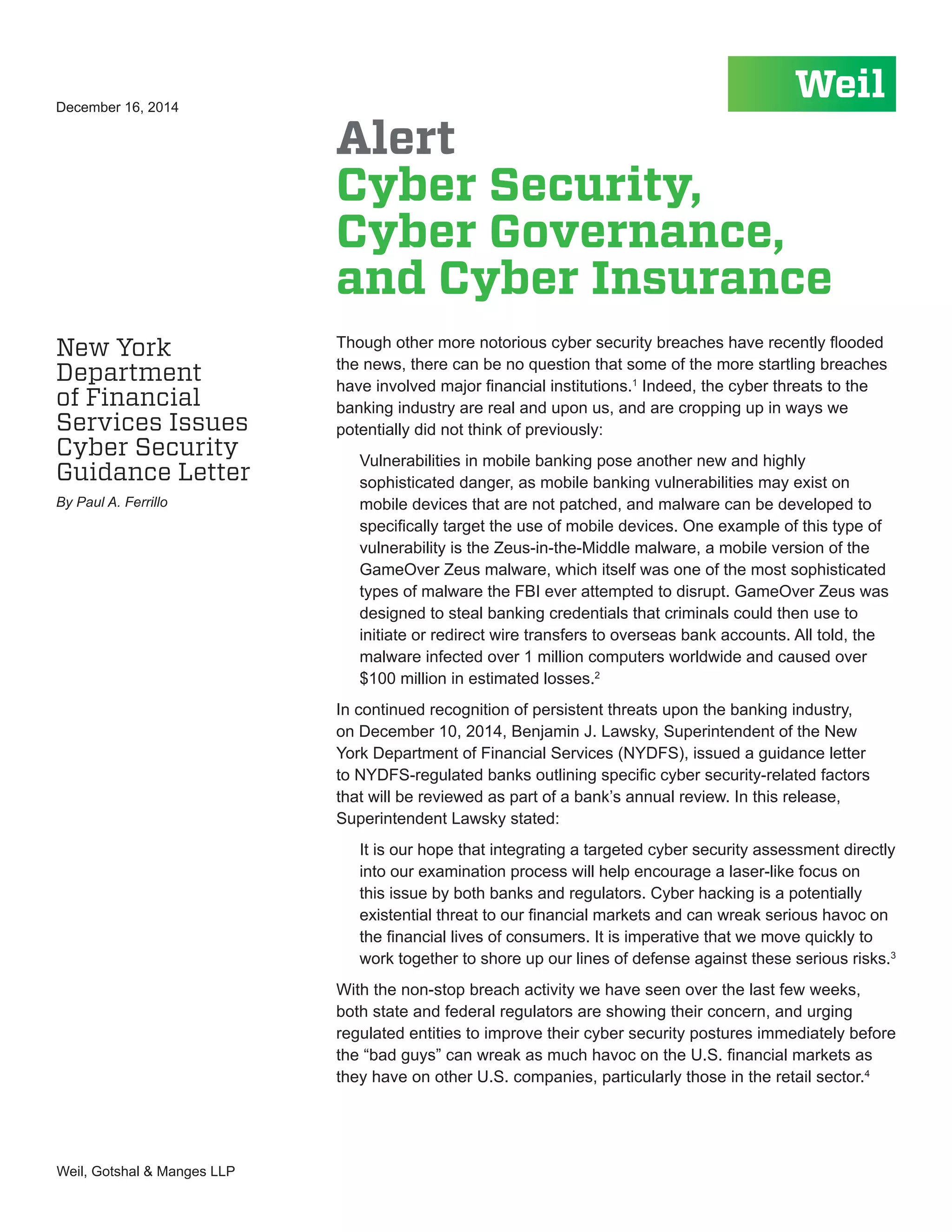 Major financial institutions have been the target of some of the most startling cyber security breaches in recent years. Mobile banking poses a new threat, as malware can specifically target mobile devices to steal banking credentials. In response, the New York Department of Financial Services has issued new cyber security guidance for banks, urging them to improve protections such as multi-factor authentication and incident response plans. Proper cyber governance, insurance, and continual assessment of risks are needed to promote cyber resilience among financial organizations.