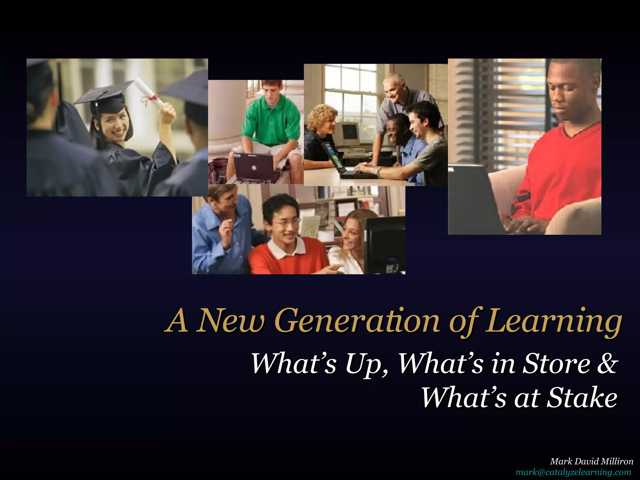 The document discusses challenges and opportunities for education in engaging with the current generation of students, known as the Net Generation. It notes that this generation spends more time online and using new technologies than previous generations. To effectively serve Net Gen students, educational institutions will need to blur boundaries between online and face-to-face learning, embrace new mobile technologies, leverage gaming and social networking, and use analytics to personalize education. Creating a sustainable learning environment requires vision, planning, fundraising and maintaining facilities and operations.