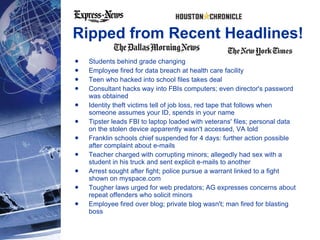 The document discusses cyber safety and appropriate technology use. It begins by providing examples of technology-related incidents and then outlines the CyberSMART principles of security, manners, acceptable use, responsibility and training. Potential issues teachers and employees may face are discussed through classroom and office scenarios. Guidelines are provided around passwords, email use, data confidentiality and digital citizenship. The key messages are the importance of security, responsible and appropriate technology use, and understanding applicable policies and regulations.