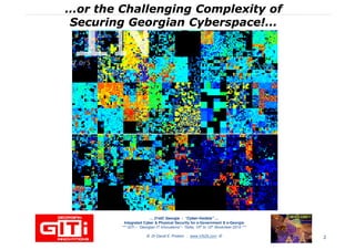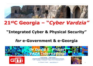 The document discusses the importance of integrated cyber and physical security in Georgia's e-government initiatives. It provides an overview of cybersecurity challenges, reviews national case studies, and proposes frameworks for enhancing Georgia's cybersecurity measures. Recommendations include upgrading critical infrastructure to international standards and fostering a cybersecurity culture across sectors.