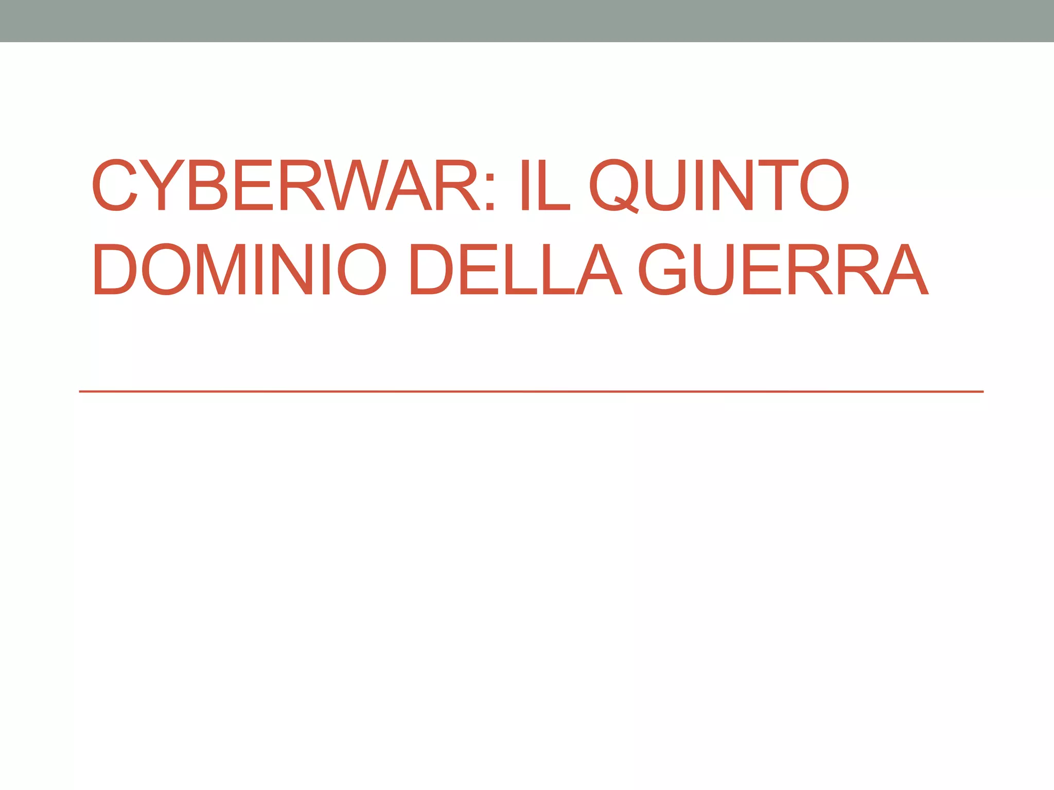 Il documento esplora il concetto di cyberwar come un nuovo dominio di conflitto, in cui stati e hacker utilizzano attacchi informatici per causare danni a livelli tale da influenzare opinioni pubbliche e infrastrutture critiche. Viene discusso il ruolo degli hacker, le diverse armi informatiche e alcuni storici eventi di cyberwar, come l'attacco DDoS all'Estonia del 2007 e il virus Stuxnet. Inoltre, si evidenzia come anche il potere dei social network stia trasformando le strategie di guerra e propaganda.