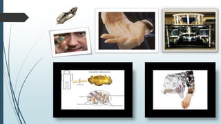 This document discusses cyborgs, which are humans enhanced with both biological and technological parts. It provides a brief history of cyborgs, including how the term was coined in 1960. It then describes different types of cyborgs, such as those meant for convenience or to replace damaged body parts. The document outlines some applications of cyborg technology in medicine, the military, and sports. It notes advantages like returning function and increased abilities, as well as disadvantages like expense and possible loss of humanity. In conclusion, it suggests that while cyborgs have downsides, their future intelligence could help protect humanity if needed.