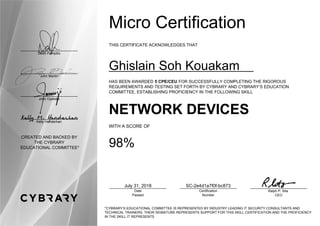 This certificate acknowledges that Ghislain Soh Kouakam has earned 5 continuing education credits for successfully completing and scoring 98% on Cybrary's certification exam for proficiency in network devices. The certification was issued on July 31, 2018 and was backed by Cybrary's Educational Committee comprised of IT security consultants and technical trainers who validated the exam and certified the proficiency level.