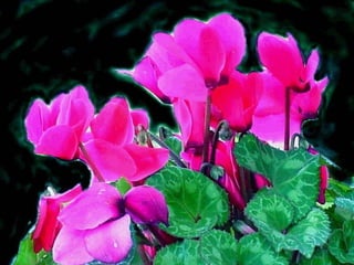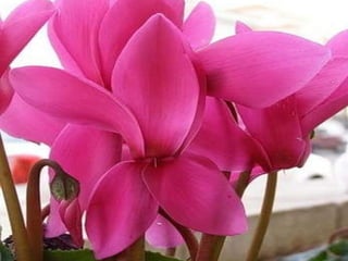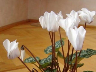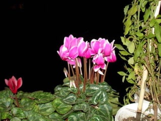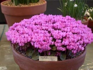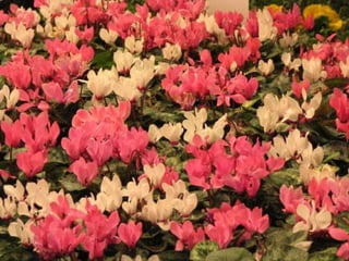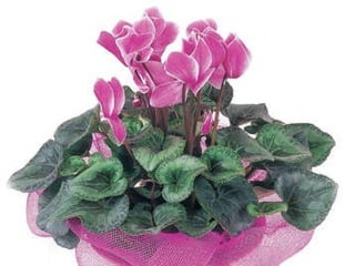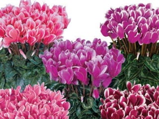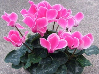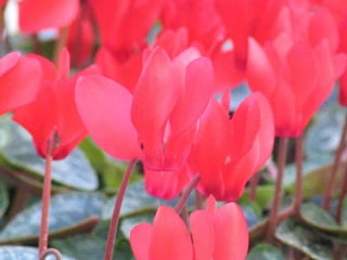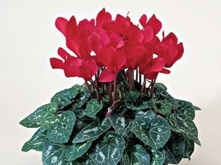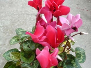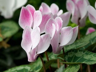 Cyclamen is a genus of 23 flowering plant species traditionally classified as primulaceae but now classified as myrsinaceae. Cyclamen are native to the Mediterranean region from Spain to Iran and northeast Africa. Each leaf or flower grows individually on a stem. The leaves are usually variegated with a pale silvery mark in the middle. Cyclamen are used as a food source by larvae of some moth species. They typically grow in dry forests or scrublands where they receive some shade. Species vary in frost tolerance from tolerating temperatures down to -15°C to not tolerating any frost.