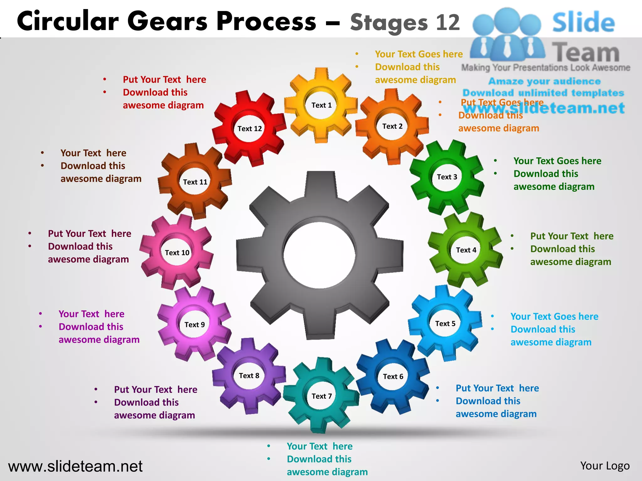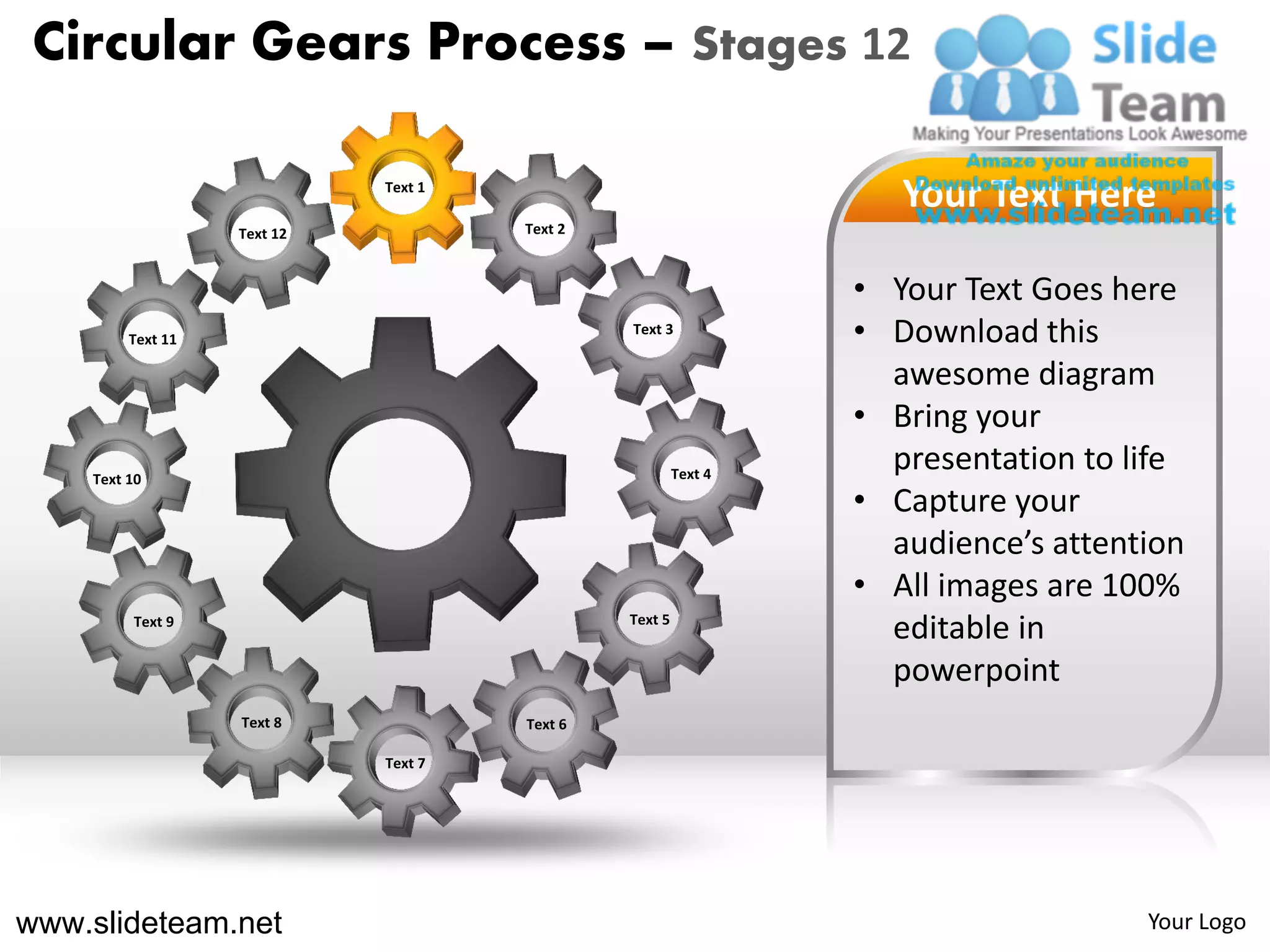 The document outlines a 12-stage circular gears process. Each stage is represented by labeled text boxes arranged in a circular formation, with arrows connecting the boxes to show the process flow. Additional text provides instructions on customizing the diagram for presentations.