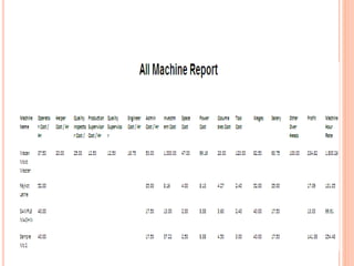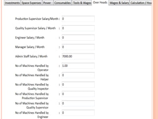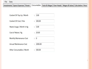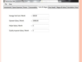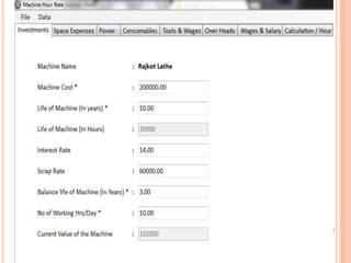 The Machine Hour Rater (MHR) is a tool developed by an experienced mechanical engineer to accurately calculate machine hour rates using over 50 parameters. It aims to meet customer requirements for precision in manufacturing while being user-friendly and allowing data import/export. Features include file saving in various formats and backup options for future use.