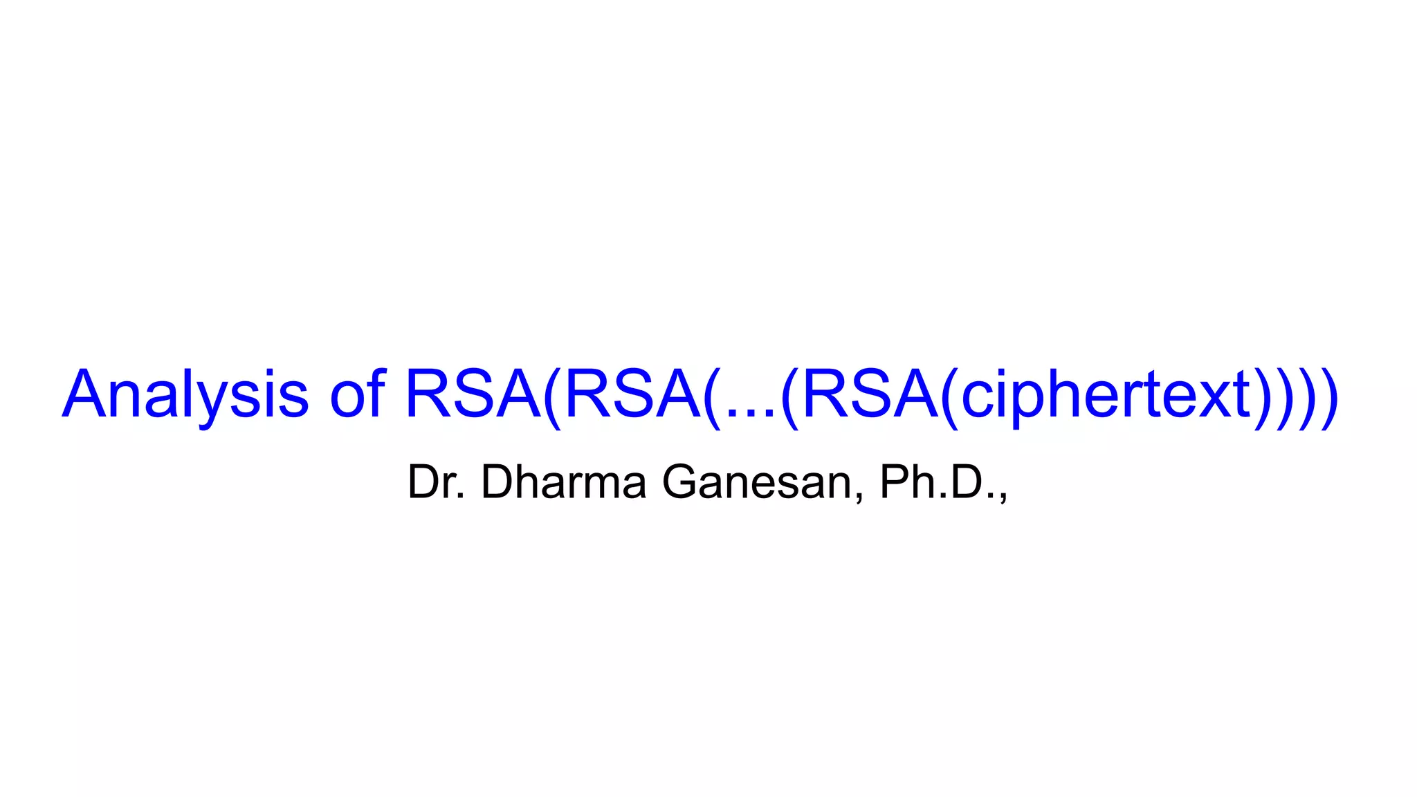 The document explores the implications of repeatedly encrypting a ciphertext using RSA, discussing whether a secret can be uncovered through cyclic encryption. It explains the RSA key generation process, the underlying mathematical concepts, and demonstrates how an attacker can find the plaintext through a cyclic attack, although this method is noted to have exponential complexity and is not a practical threat. The conclusion emphasizes the importance of using proper padding techniques in RSA encryption to mitigate vulnerabilities.