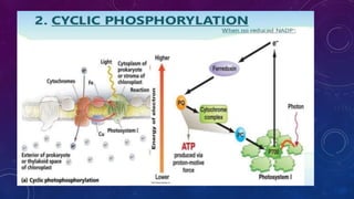 This document presents a topic on cyclic photophosphorylation. It begins with an introduction to photophosphorylation and defines cyclic photophosphorylation. There are two types of photophosphorylation: cyclic and non-cyclic. Cyclic photophosphorylation involves the same excited electron returning to the excited chlorophyll, producing one ATP molecule. The mechanism involves an electron being energized in photosystem I and passing through an electron transport system before returning to the reaction center. This releases energy to produce ATP. The steps involve an electron moving from P700 to acceptors to the cytochrome complex and back to P700, producing one ATP via chemiosmosis.