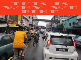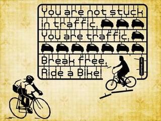 This document is a presentation by Islam Inzamamul on the topic of cycling. It discusses the many benefits of cycling, including improved health and fitness, reduced pollution, time savings for commutes, and increased freedom and independence. It notes cycling can help solve traffic problems. It then provides specifics on the presenter's 4.2km commute by bicycle versus car, saving 50 minutes per day. It outlines how bicycle culture is growing and can help address congestion issues. A number of additional health, social, and environmental benefits of cycling are highlighted.