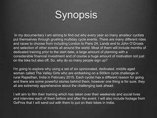 The documentary will follow six middle-aged women from the UK embarking on a grueling 500km cycling challenge in rural Rajasthan, India. It will explore each of their motivations for taking part in such a strenuous multi-day event and document their training leading up to the challenge. Using interviews and footage from cameras mounted on the cyclists' bikes, the documentary will provide a personal look at the highs and lows of the experience and what drives everyday amateur cyclists to push their physical limits.