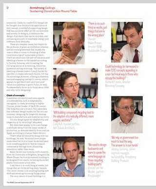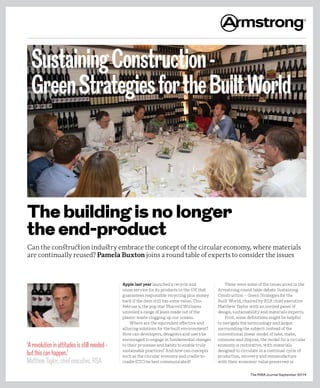 The document discusses the urgent need for a shift in the construction industry towards sustainable practices, particularly through the adoption of the circular economy and cradle-to-cradle design principles. It features insights from a round table of experts who highlight the complexities and obstacles of implementing these concepts, the role of government, and the importance of innovative business models and leadership. Ultimately, it emphasizes that a revolution in attitudes and processes is necessary to foster a more sustainable built environment.