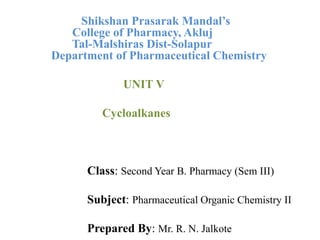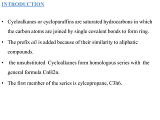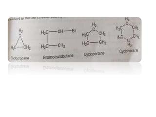 This document provides information about cycloalkanes. It discusses their structure, naming conventions, methods of preparation, physical and chemical properties, and theories explaining their stability. Cycloalkanes are saturated hydrocarbons that form rings, with the general formula CnH2n. The most important theories discussed are Baeyer's strain theory, which proposes bond angle deviations cause strain, and the Sachse-Mohr theory, which suggests higher cycloalkanes relieve strain by puckering out of planar structures. Cyclopropane is the least stable due to high bond angle deviations from tetrahedral.