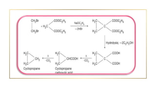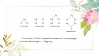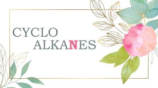 Cycloalkanes are cyclic hydrocarbons whose rings are formed entirely of carbon-carbon single bonds. They have the general formula CnH2n. There are several methods to prepare cycloalkanes, including Freund's method using α,ω-dihalides, the Wislicenus method using barium or calcium salts of dicarboxylic acids, and addition of carbenes to olefins to form cyclopropane derivatives. Cycloalkanes are named using IUPAC rules, which involve identifying the parent chain with the maximum number of carbons and using the prefix "cyclo-". They can be classified into groups based on ring size.