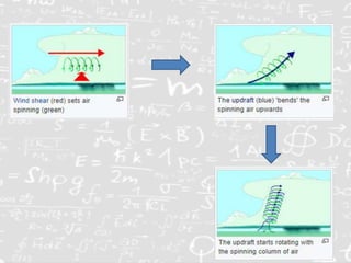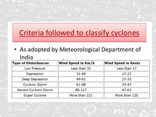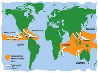 Cyclones are rapidly rotating storm systems that form over warm tropical oceans. They are known as hurricanes in the Atlantic/Northeast Pacific, typhoons in the Northwest Pacific, and tropical cyclones in the South Pacific/Indian Ocean. Cyclones form through the rising of warm, moist air which causes an area of low pressure and draws in surrounding higher pressure air, fueling the storm system through heat release. They can cause extensive damage upon making landfall through strong winds, storm surge, heavy rain, and tornadoes.