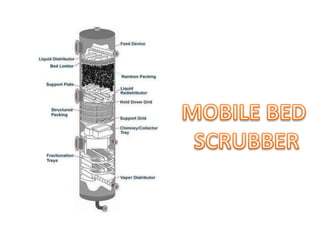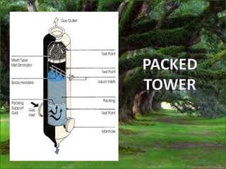 Packed towers are filled with small objects like catalyst particles or absorbents to perform separation processes like absorption, stripping, and distillation. Wet scrubbers describe devices that remove pollutants from gas streams by bringing the polluted gas into contact with a scrubbing liquid, either by forcing it through a liquid pool or other contact method, to remove the pollutant.