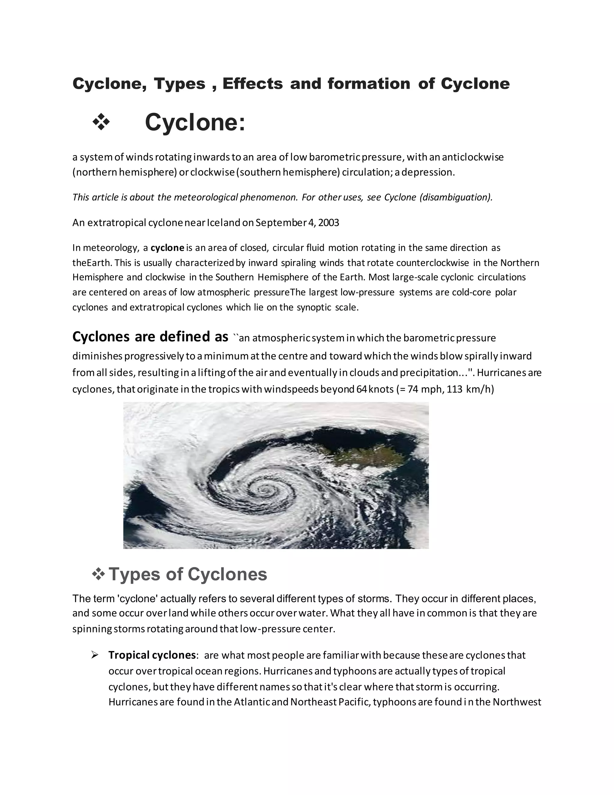 Cyclones form due to rising warm air that cools and condenses to form clouds. If the air starts spinning horizontally over tropical oceans, it can develop into a tropical depression, storm, and eventually a hurricane or typhoon depending on location and wind speeds. Cyclones cause heavy rainfall, landslides, damage to infrastructure and homes, disruption to ecosystems and agriculture, and harm to human and animal life. Coastal areas need to prepare shelters and strengthen infrastructure to mitigate cyclonic damage.