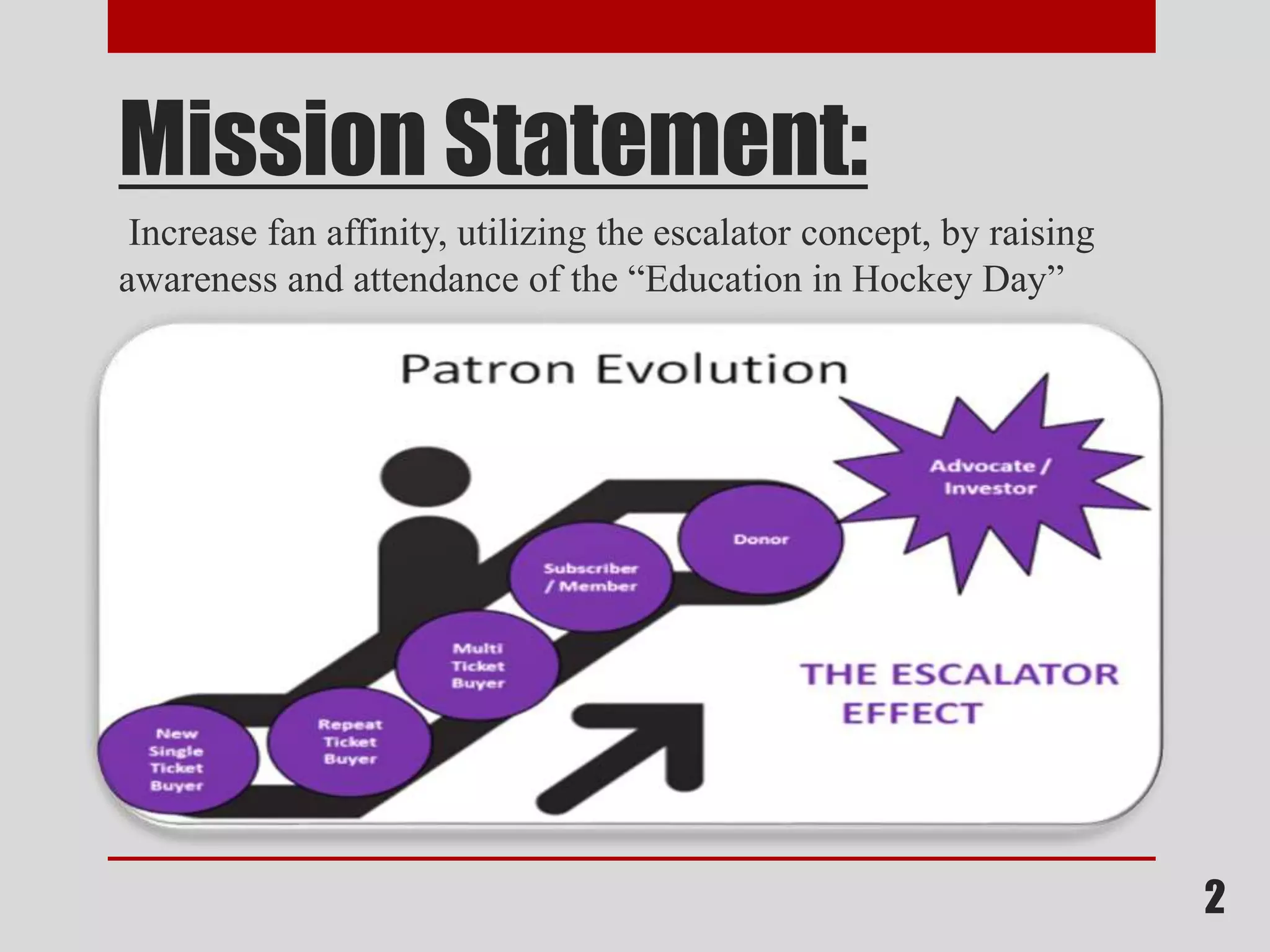 The document summarizes a marketing plan for an "Education in Hockey Day" event by the Cincinnati Cyclones. It includes the results of surveys of educators to assess awareness of the event and factors influencing school field trips. The surveys found low awareness but an appropriate price point. The plan recommends renaming the event to "Education Through Hockey" and developing grade-specific educational materials to increase attendance.