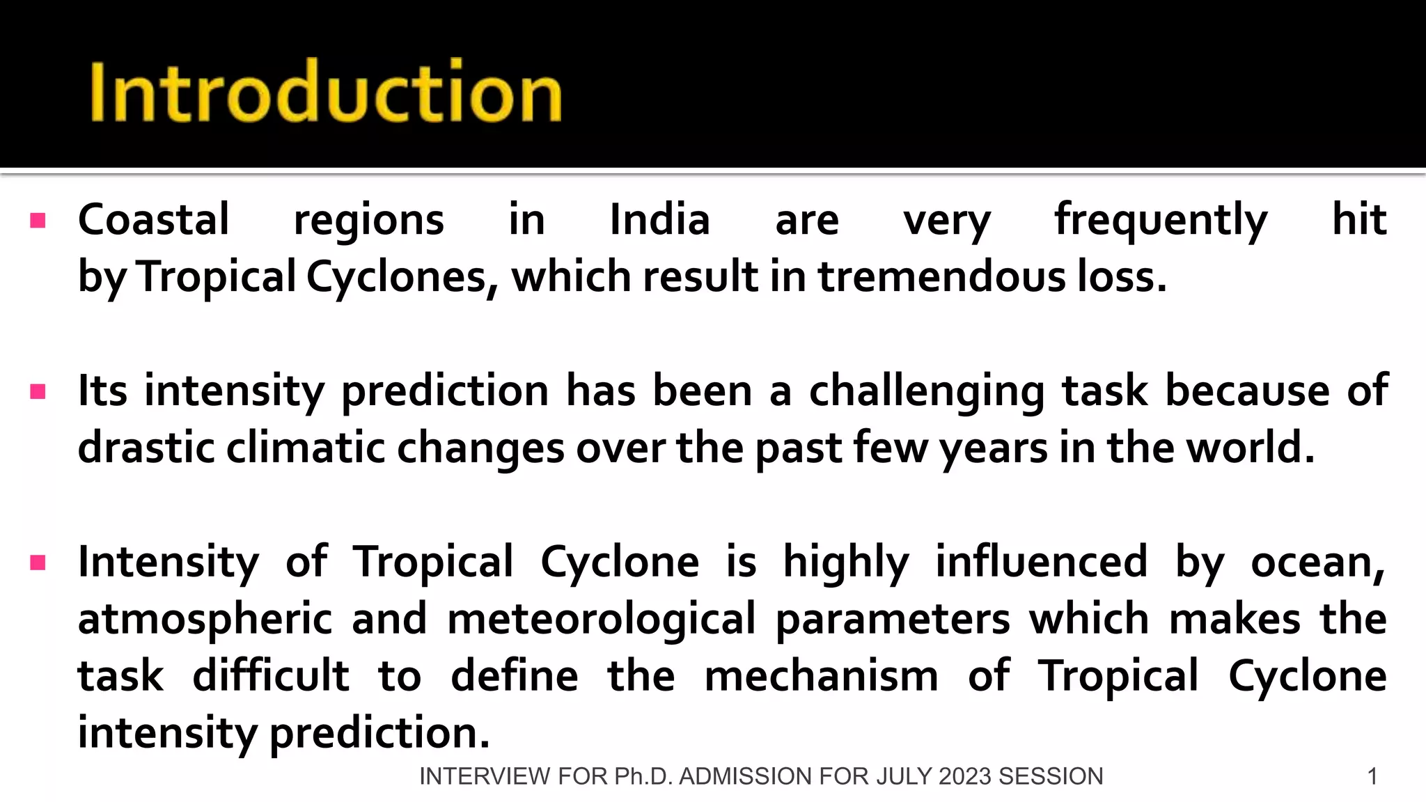 The document discusses tropical cyclones that frequently impact coastal regions in India, causing tremendous loss. It notes that predicting tropical cyclone intensity is challenging due to climate changes. Intensity is influenced by oceanic, atmospheric, and meteorological parameters. The proposed research aims to develop hybrid learning models combining machine learning techniques to improve intensity predictions and provide timely warnings. The objectives are to enhance prediction accuracy, extend lead times, and provide probabilistic forecasts to help decision-making.