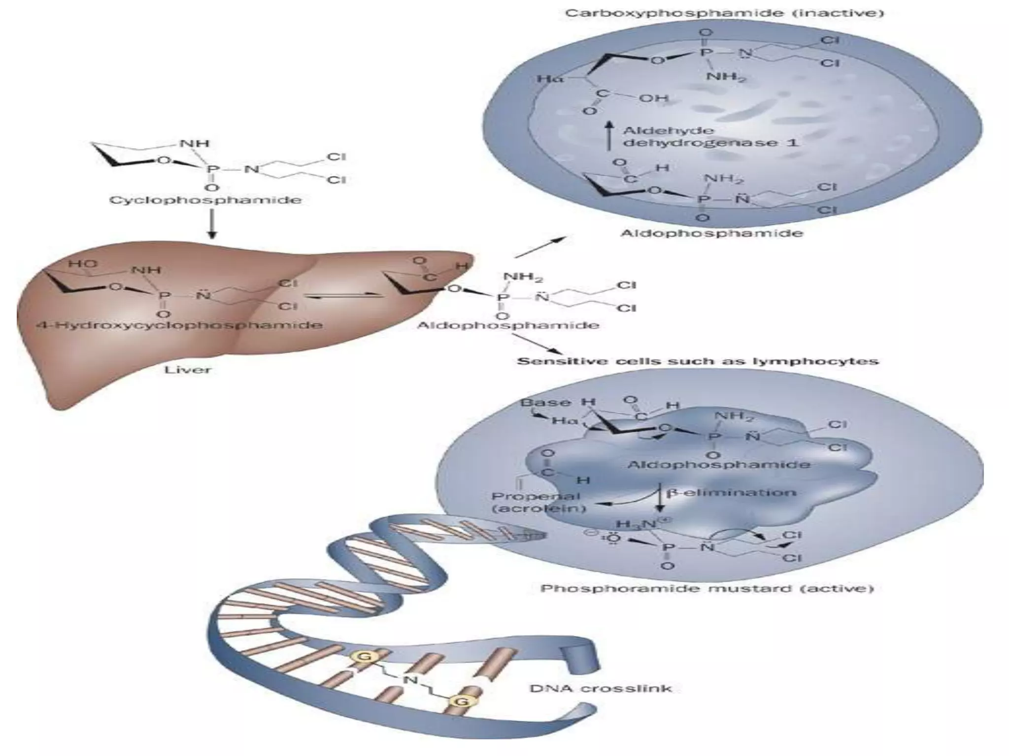 Cyclophosphamide is an alkylating agent used to treat white blood cell cancers and lymphoma. It works by being metabolized into phosphoramide mustard, which adds alkyl groups to DNA, forming crosslinks between and within DNA strands. This leads to DNA damage and ultimately cell death. The expression of genes coding for enzymes involved in cyclophosphamide metabolism, such as cytochrome P450 and ALDH, can affect how sensitive cancer cells are to the drug.