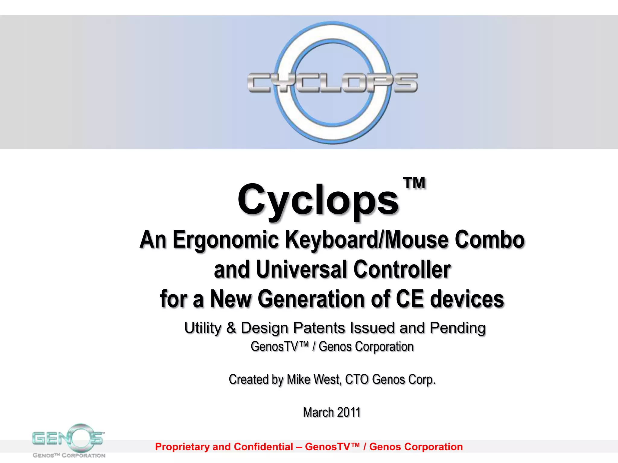 The CyclopsTM is an ergonomic wireless keyboard and mouse combo designed for modern consumer electronics, featuring a full QWERTY keyboard and mouse track pad that enhance on-screen interaction. It supports up to eight devices, offers customizable aesthetics, and provides long-range functionality with wireless and infrared control. The design accommodates a wide range of hand sizes and allows for comfortable typing with both single and two-finger methods.