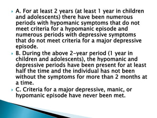 The document outlines the diagnostic criteria for cyclothymic disorder and substance/medication-induced bipolar and related disorders, emphasizing the duration and nature of mood disturbances, along with the requirement of significant distress or impairment in functioning. It provides prevalence statistics, age of onset for cyclothymic disorder in children, and specifics on the relationship between substance use and mood disturbances. Additionally, it mentions that there are no comprehensive epidemiological studies on substance-induced manic disorders and describes how the timing and nature of substance effects can influence the presentation of manic symptoms.