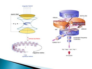 Cyclotrons accelerate charged particles using oscillating electric fields generated between hollow metal chambers called dees. A positive ion is placed between the dees and accelerated toward the first dee when it is negatively charged. The magnetic field causes the ion to travel in a semicircular path, and it is accelerated again when the dee polarities reverse just as the ion reaches the gap. This process continues to accelerate the ion with each pass. Cyclotrons can be used to accelerate proton beams for nuclear physics experiments and cancer treatment through proton therapy.
