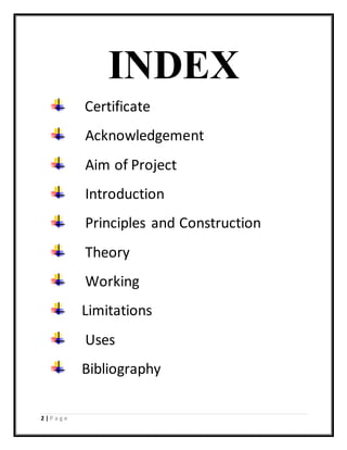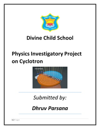 The document is a student project report on cyclotrons. It includes an introduction describing cyclotrons, their principles and construction which involve two dees positioned between magnet poles that accelerate charged particles in a spiral path. The report further describes the theory behind how cyclotrons work using magnetic and electric fields to accelerate particles. It also discusses the limitations and uses of cyclotrons such as studying nuclear reactions and producing neutrons.