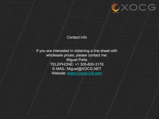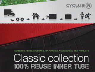 Xocg is an interactive branding firm that partnered with Cyclus Colombia to launch Cyclus, specializing in sustainable and fashionable accessories made primarily from recycled tire rubber. Founded in 2002, Cyclus emphasizes eco-friendly practices and has grown to employ over 35 people in Colombia while expanding its market presence in North America and Europe. The document details a wide range of products including bags, backpacks, handbags, wallets, and bike accessories, all designed with responsible consumption in mind.