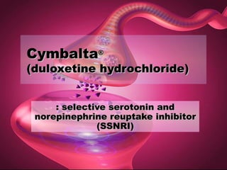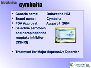 Generic name:Generic name:DDuloxetine HCluloxetine HCl Brand name: CymbaltaBrand name: Cymbalta FDA Approval: August 4, 2004FDA Approval: August 4, 2004 SSelective serotoninelective serotonin andand norepinephrinenorepinephrine reuptake inhibitorreuptake inhibitor (SSNRI)(SSNRI) Treatment forTreatment for Major depressive DisorderMajor depressive Disorder Generic name:Generic name: DDuloxetine HCluloxetine HCl Brand name: CymbaltaBrand name: Cymbalta FDA Approval: August 4, 2004FDA Approval: August 4, 2004 SSelective serotoninelective serotonin andand norepinephrinenorepinephrine reuptake inhibitorreuptake inhibitor (SSNRI)(SSNRI) Treatment forTreatment for Major depressive DisorderMajor depressive Disorder cymbaltacymbalta IntroductionIntroduction