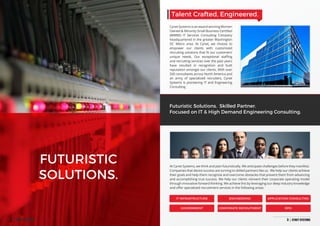 Cynet Systems is an IT and engineering consulting firm that provides staffing and recruiting services. It has over 500 consultants across North America and specialized recruiters. The document discusses Cynet's customized recruiting solutions, areas of expertise including IT infrastructure, engineering, and government. It provides case studies of clients such as CenturyLink, HCL America, L&T Technology Services, and HERE.com. Cynet aims to meet clients' unique talent needs through an established national staffing network and effective recruiting process.