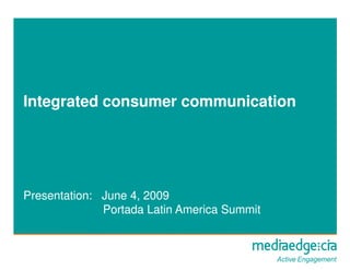 The document discusses the integration of consumer communication across various media and geographic boundaries in Latin America, highlighting the convergence of technology and the impact of cultural interests like sports and social responsibility. It emphasizes the importance of consumer insights for brands to effectively engage audiences through tailored content and integrated communication strategies. The document also notes the significant role of social media and the potential return on investment from innovative marketing approaches during economic downturns.