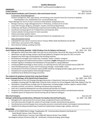 Cynthia Wartanian has over 10 years of experience in e-commerce, brand management, marketing, and fundraising. She currently works as the Internet Brand Coordinator and E-Commerce, Sales and Customer Service Lead for London Jewelers, where she manages three e-commerce websites, marketing strategies, and training programs. Previously, she held senior roles at NYU Langone Medical Center and The Leukemia & Lymphoma Society, where she led fundraising campaigns, established social media and technology committees, and increased annual revenues. She has a Bachelor's degree from Marist College and gemological certificates from GIA.