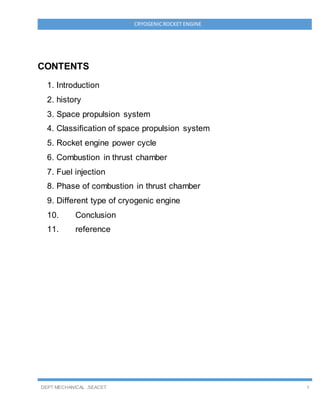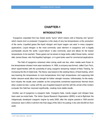 This document provides an introduction and overview of cryogenic rocket engines. It discusses the history of cryogenics and rocket propulsion. Some key points include: