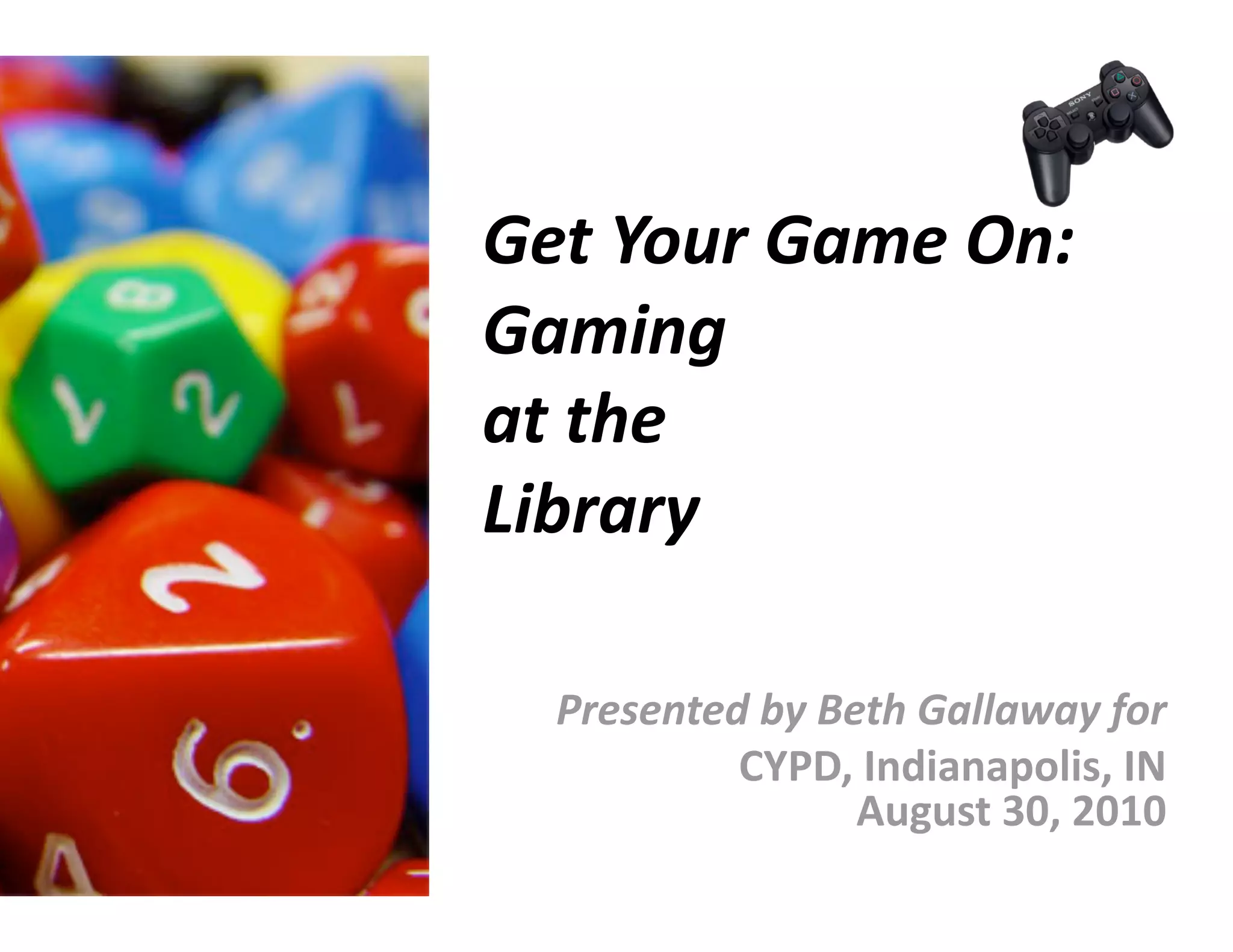 This document summarizes a presentation about gaming at libraries. It discusses how gaming can promote 21st century literacy skills and how libraries can implement gaming programs. Examples are provided of successful gaming programs at various libraries, including video game tournaments, board game clubs, and using games to teach information literacy skills. Research that shows the educational benefits of gaming is also summarized. The document concludes by providing tips for libraries to implement their own gaming programs.