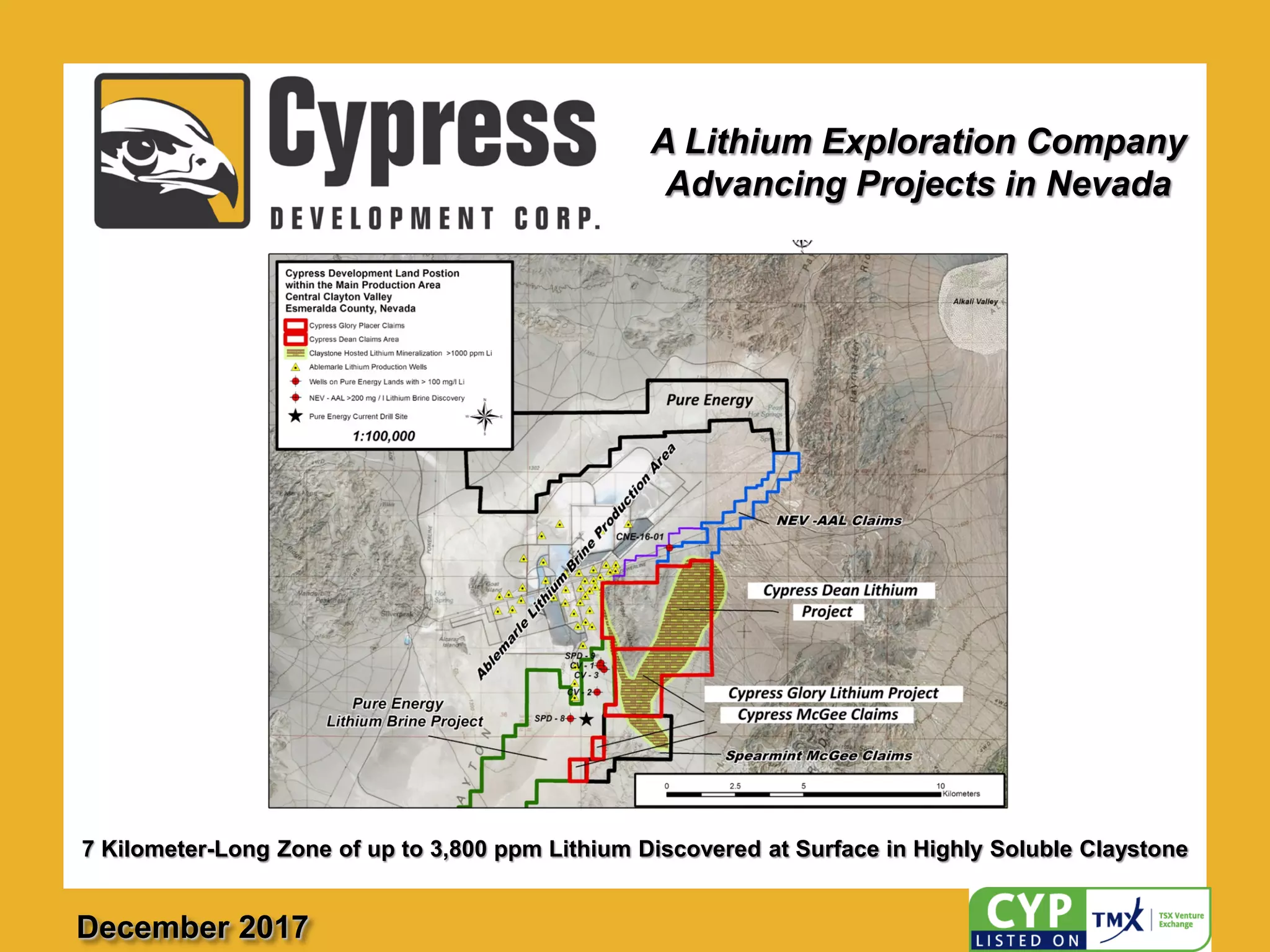 A lithium exploration company discovered a 7 kilometer zone of lithium-rich claystone at its Dean and Glory projects in Nevada, with samples up to 3,800 ppm lithium. Drilling at Dean identified strong near-surface lithium mineralization over 65 meters thick across the property. Laboratory testing showed the claystone is highly soluble, potentially allowing direct lithium production without complex processing. Cypress plans additional drilling and testing to define a resource and evaluate extraction methods from the abundant claystone.