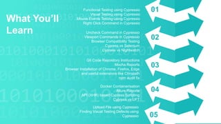 This document outlines a course on using Cypress for automated testing, covering topics like functional testing, visual testing, and API testing. Participants will learn various test techniques, including BDD and TDD, and the course is suitable for quality assurance professionals and testers looking for hands-on experience. The course promises practical training with access to an open-source project and relevant coding resources.
