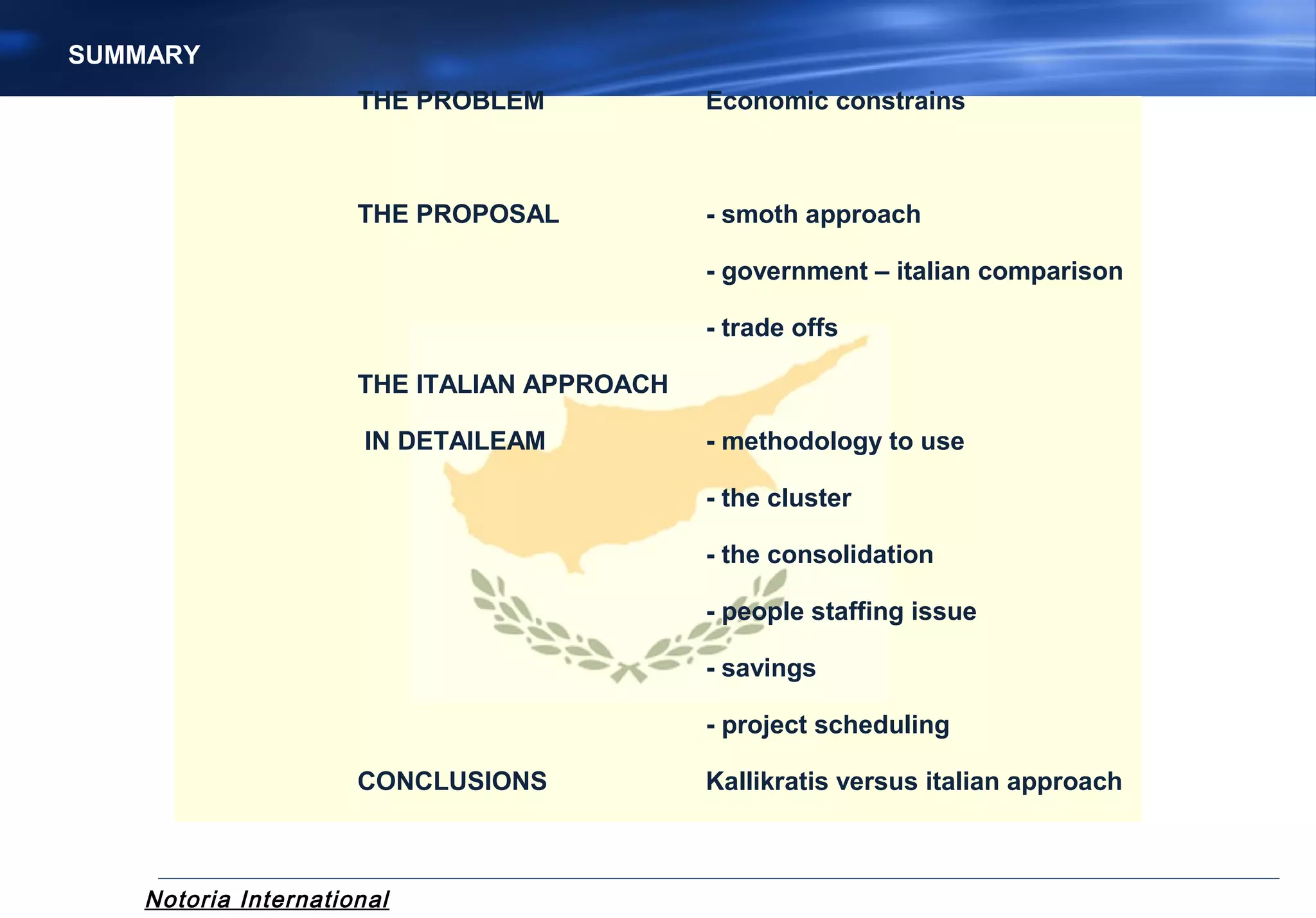 THE ITALIAN APPROACH - The approach involves 3 phases: 1) optimizing processes, 2) cooperation between municipalities and communities through resource sharing, and 3) clustering municipalities and communities to consolidate services and reduce costs.