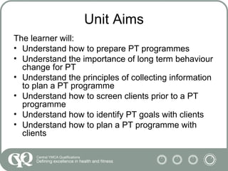 This document outlines the requirements for a personal training certification program. It details what students will learn, including how to prepare training programs, promote long-term behavior change, collect client information, and develop goals. It also describes how students will be assessed, including a case study requiring a 4-week sample training program and 12-week overview for a client, as well as an in-person evaluation of their knowledge. Key topics covered are collecting medical histories, setting SMART goals, adapting programs over time, and using strategies to encourage clients' long-term commitment to exercise.