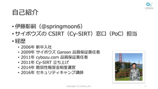 ビジネスを脅かすサイバー攻撃は避けられないリスクとなりつつあります。 サイボウズではこうしたリスクに対処するセキュリティ体制を、2017 年に見直すこととしました。 本セッションでは、その過程を Cy-SIRT 事務局の伊藤からご紹介いたします。