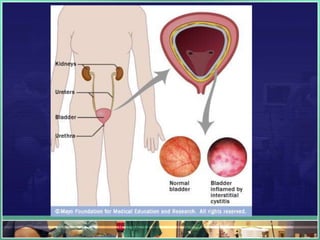 The document discusses cystitis, or urinary bladder inflammation. It defines cystitis as a urinary tract infection that affects the bladder. The most common cause is bacterial infection, which can occur when bacteria enter the bladder from the urethra or anus. Common symptoms include pain or burning during urination, frequent urination in small amounts, and bloody or cloudy urine. Treatment typically involves antibiotics and self-care measures like drinking water and avoiding irritants. Preventative measures include proper hygiene and not delaying urination.
