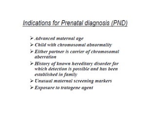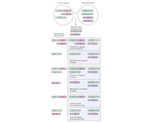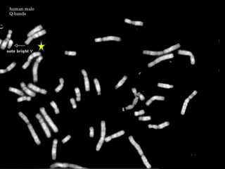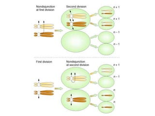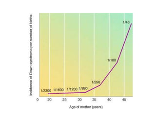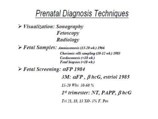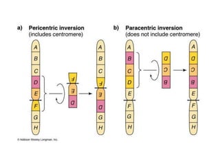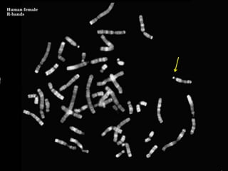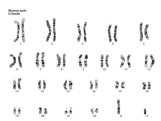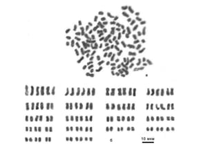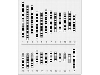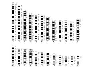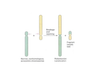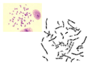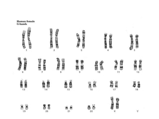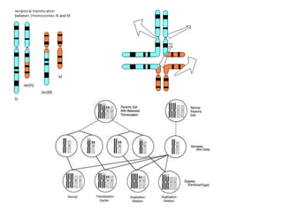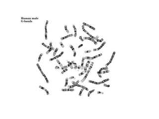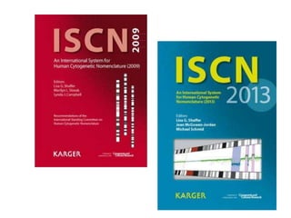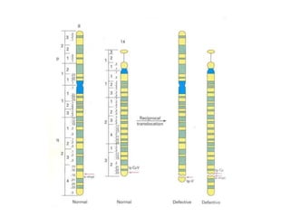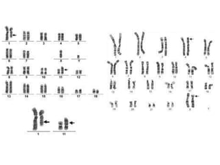 This document provides an overview of cytogenetics and chromosomal abnormalities. It begins with the history of cytogenetics, including the discovery of human chromosomes in 1882 and establishing the normal human karyotype of 46 chromosomes in 1956. It describes laboratory techniques for culturing and staining chromosomes, including various banding techniques. It discusses clinical cytogenetics and genetic counseling. It provides detailed explanations and examples of different types of numerical and structural chromosomal abnormalities, including aneuploidies, polyploidies, translocations, inversions, deletions and more. It explains the associated phenotypes and inheritance patterns of many common chromosomal syndromes.