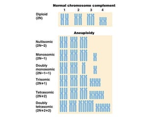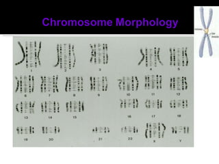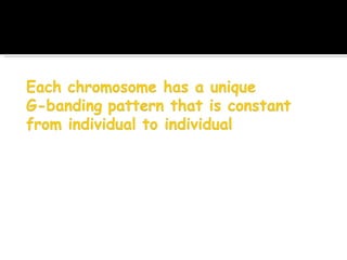 The document discusses cytogenetics, which involves the study of chromosomes through cell culture and karyotyping. Chromosomes can be analyzed for their number and structure to detect abnormalities. Specific staining techniques like Q-, G-, R-, and C-banding produce distinct banding patterns that allow identification of each chromosome type. Karyotyping involves organizing chromosomes based on these patterns to detect any abnormalities associated with diseases.